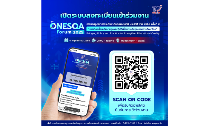 สมศ. ขอเชิญชวนผู้ที่สนใจ เข้าร่วมงานประชุมวิชาการระดับชาติและนานาชาติ เนื่องในโอกาสครบรอบ 25 ปี สมศ. ONESQA Forum 2025 ครั้งที่ 2 “ขับเคลื่อนนโยบายสู่การปฏิบัติ เพื่อยกระดับคุณภาพการศึกษาไทย” (Bridging Policy and Practice to Strengthen Educational Quality) วันอังคารที่ 4 พฤศจิกายน 2568 ณ สโมสรทหารบก วิภาวดี กรุงเทพมหานคร เวลา 09.00 – 16.30 น. โดยผู้ที่สนใจสามารถสแกนคิวอาร์โค้ดตั้งแต่วันนี้ จนถึงวันที่ 18 ตุลาคม 2568 มาร่วมเป็นส่วนหนึ่งในการขับเคลื่อนคุณภาพการศึกษาไทยสู่อนาคตที่ดีกว่าไปด้วยกัน
