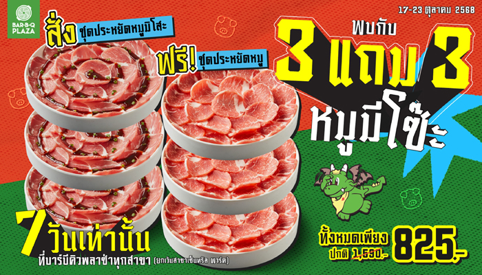 โปรโมชันพิเศษมีเวลาเพียง 7 วันเท่านั้น! ตั้งแต่วันที่ 17 – 23 ตุลาคม 2568 ที่ร้านบาร์บีคิวพลาซ่าทุกสาขา (ยกเว้นสาขาเซ็นทรัล พาร์ค) อิ่มฟินได้ทั้งที่ร้าน สั่งกลับบ้าน หรือผ่าน GON Delivery คุ้มจริงเกินต้าน อย่าปล่อยให้พลาด! รีบแท็กเพื่อน ชวนครอบครัวมาเช็กอินความอร่อยคุ้มกันที่ บาร์บีคิวพลาซ่า ได้เลย