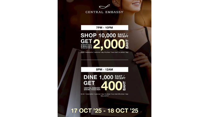 • เพียงช้อปครบ 10,000 บาทต่อใบเสร็จ จากร้านค้าในหมวด Fashion & Lifestyle รับ Central Embassy Voucher มูลค่า 2,000 บาท จำนวนจำกัดเพียง 120 รางวัลต่อวัน รวม 240 รางวัลตลอดรายการ โดยแจกของรางวัลทุกชั่วโมง (เวลาโปรโมชัน 19.00 – 22.00 น.)