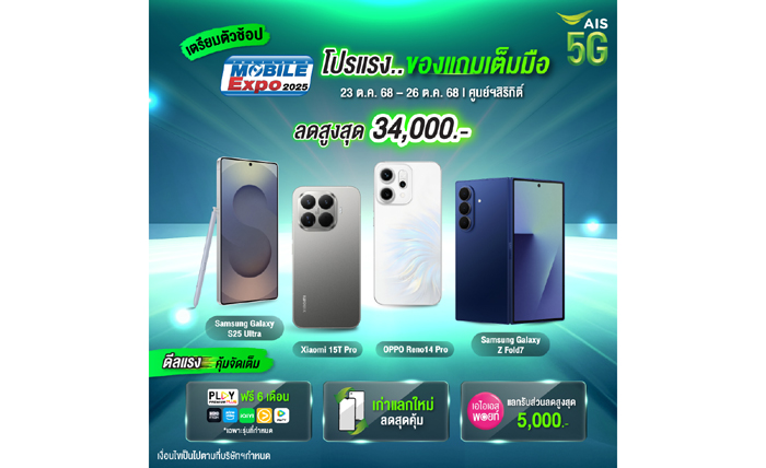 เอไอเอส ตอกย้ำการเป็นศูนย์รวมด้านดิจิทัลไลฟ์สไตล์แบบครบวงจร เติมเต็มทุกประสบการณ์ด้วยสมาร์ทโฟนและไลฟ์สไตล์ดิจิทัล พร้อมส่งมอบทุกโซลูชันส์ และความสุขส่งท้ายปี 2025 อย่างยิ่งใหญ่ ด้วยแคมเปญโปรโมชั่นสุดร้อนแรงแห่งปี ในงานมหกรรมมือถือที่ใหญ่ที่สุดในประเทศ Thailand Mobile Expo 2025 ที่จัดขึ้นระหว่างวันที่ 23 – 26 ตุลาคม 2568 ณ บูธ PL10 ศูนย์การประชุมแห่งชาติสิริกิติ์ จัดเต็มกว่าที่เคย ดีลสมาร์ทโฟนตัวท็อป อาทิ iPhone, Samsung, Xiaomi และ OPPO ลดแรงที่สุดแห่งปีสูงสุด 34,000 บาท และเนื่องในโอกาสฉลอง 35 ปี ขอมอบความว้าว เพียงใช้ AIS Points 1 คะแนน แลกรับส่วนลด 200 บาท สำหรับซื้อสินค้ากลุ่ม Gadget หรือ Accessories มูลค่า 2,000 บาท ต่อใบเสร็จ พร้อมเปิดตัวฟีเจอร์ใหม่กล้องอัจฉริยะ AiCAM และดีไวซ์สุดล้ำระดับเทพ และมากกว่าการซื้อสมาร์ทโฟน ลูกค้ายังได้รับสิทธิพิเศษชมความบันเทิงฟรี! ด้วย Entertainment Platform อย่าง AIS PLAY ที่รวมที่สุดแห่งความบันเทิงและกีฬา ดูพรีเมียร์ลีกสด ครบทุกแมตช์ นาน 3 เดือน และ Play Premium Plus สนุกเต็มแมกซ์ กับ 5 แอปดัง นาน 6 เดือน* เฉพาะรุ่นที่กำหนด เติมเต็มทั้งสมาร์ทโฟนและไลฟ์สไตล์ในแพ็กเกจเดียว พร้อมของแถมจัดเต็ม