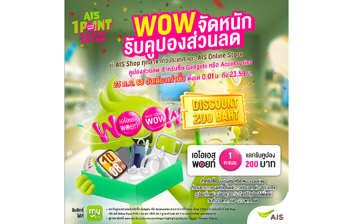นอกจากนี้ ในโอกาสครบรอบ 35 ปี เอไอเอสขอแทนคำขอบคุณลูกค้า มอบสิทธิพิเศษผ่านแคมเปญสุดยิ่งใหญ่ “AIS 1 POINT 12 WEEKS 12 WOW” ที่แจกใหญ่ไม่มีหยุด โดยว้าวนี้เอาใจสาย Gadget และ Accessories โดยเฉพาะ เพียงใช้ AIS Points 1 คะแนน* แลกรับฟรี! ส่วนลด 200 บาท สำหรับซื้อสินค้ากลุ่ม Gadget หรือ Accessories มูลค่า 2,000 บาท ต่อใบเสร็จ (*เฉพาะสินค้าที่ร่วมรายการ) กดรับสิทธิ์ได้ในวันที่ 23 ตุลาคม 2568 วันเดียว ผ่านแอป myAIS เท่านั้น พิเศษ! สามารถใช้สิทธิ์ได้ในงาน Thailand Mobile Expo 2025 รวมถึง AIS Shop ทุกสาขา และ AIS Online Store จนถึงวันที่ 23 พ.ย. 68 สามารถดูรายละเอียดเพิ่มเติมได้ที่ https://www.ais.th/consumers/privileges/highlight/points/ais-1point-12weeks-12wow