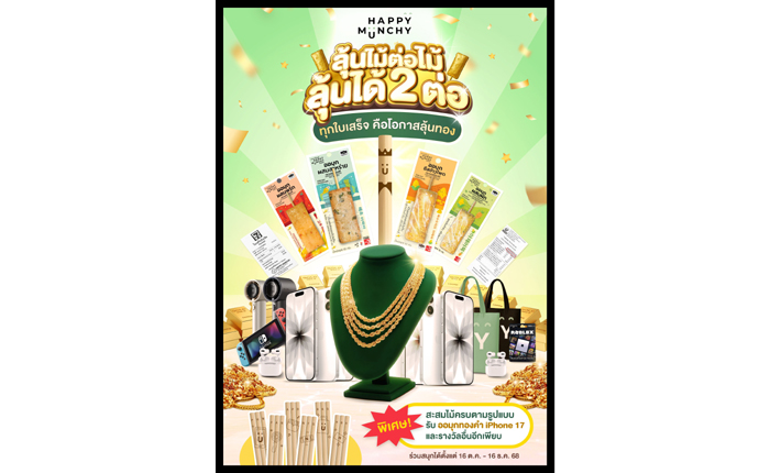 สำหรับแคมเปญ ลุ้นไม้ต่อไม้ ลุ้นได้ 2 ต่อ “Happy Munchy ฉลองครบรอบ 10 ปี จัดหนัก แจกจริงทุกไม้คือโอกาส ทุกใบเสร็จมีสิทธิ์ลุ้นทอง iPhone และของรางวัลอีกมากมายโดยมีไฮไลท์ต่อที่ 1: ทุกใบเสร็จจากการซื้อ ออมุก Happy Munchy จากร้านค้าที่ร่วมรายการ มีสิทธิ์ลุ้นสร้อยคอทองคํา และ ต่อที่ 2: สะสมไม้ให้ครบรูปแบบ ลุ้นรับของรางวัลใหญ่ทันที เช่น ออมุกทองคํา 1 บาท, iPhone 17, AirPods, Nintendo Switch และของรางวัลอื่นๆ กว่า 1,000 ชิ้น ตั้งแต่วันที่ 16 ตุลาคม – 16ธันวาคม 2568