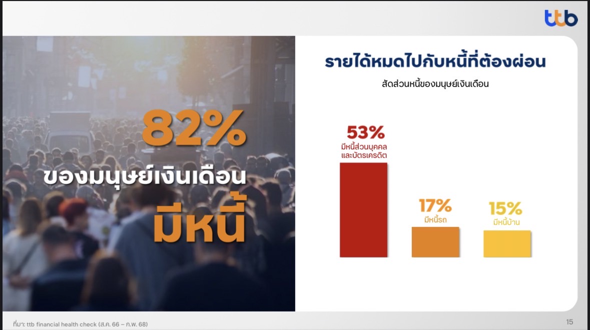 ‘นริศ สถาผลเดชา’ ประธานกลุ่มงาน Data และ Analytics ทีเอ็มบีธนชาต เผยถึงการสำรวจ ttb financial health check ตรวจสุขภาพทางการเงินของกลุ่มมนุษย์เงินเดือน พบว่า 8 ใน 10 หรือคิดเป็นกว่า 82% มี ‘ภาระหนี้สิน’ โดยภาระหนี้หลักๆ ของคนกลุ่มนี้ ได้แก่