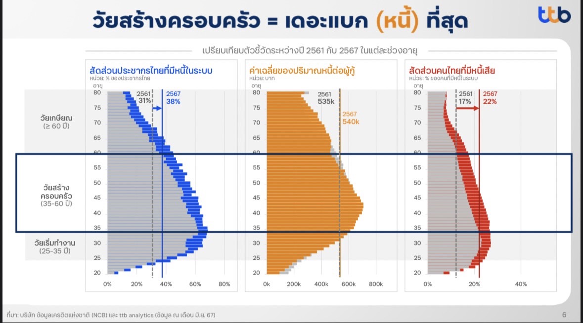 ข้อมูลจากบริษัท ข้อมูลเครดิตแห่งชาติ จำกัด (NCB) และ ttb analytics ณ เดือนมิถุนายน 2567 ระบุว่า คนไทยเกือบ 40% มีหนี้ในระบบ โดยมีหนี้สินเฉลี่ยสูงกว่า 500,000 บาทต่อคน และกลุ่มวัยสร้างครอบครัวอายุ 35-60 ปี ภาระหนี้สูงที่สุด เนื่องจากมีทั้งภาระบ้าน รถ ค่าใช้จ่ายสำหรับครอบครัวและดูแลพ่อแม่