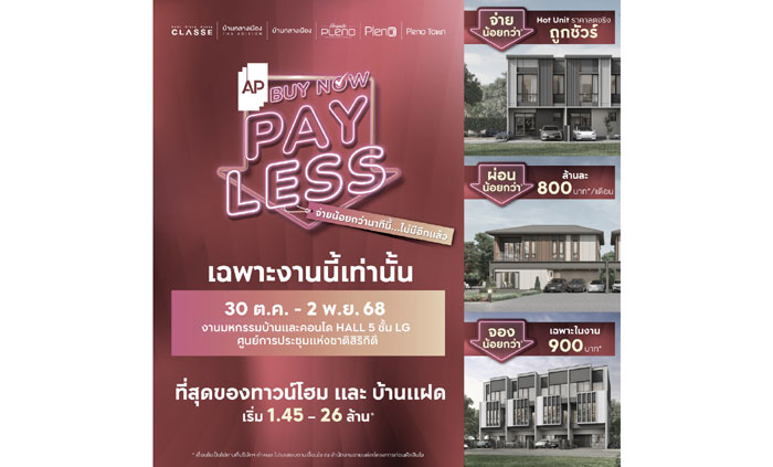 ที่สุดของชีวิตที่ลงตัว ทั้งความคุ้มค่าและดีไซน์ที่ดีที่สุดกับโครงการทาวน์โฮมและบ้านแฝดจากเอพี แบรนด์ บ้านกลางเมือง CLASSE, บ้านกลางเมือง THE EDITION, บ้านกลางเมือง, GRANDE PLENO, PLENO และ PLENO TOWN ที่ออกแบบพื้นที่ใช้สอยได้เหนือกว่า ในราคาที่เข้าถึงได้จริง (Hot Unit ราคาถูกชัวร์) ราคาเริ่มต้น 1.45 – 26 ล้านบาท* ในงานมหกรรมฯ ครั้งนี้เอพีเตรียมข้อเสนอที่ทำให้ “ผ่อนน้อยกว่า” ด้วยอัตราผ่อนเริ่มต้นเพียง ล้านละ 800 บาท*/เดือน พร้อมสิทธิ์ “จองน้อยกว่า” เฉพาะในงานมหกรรมฯ เพียง 900 บาท* ช่วยปลดล็อกทุกภาระทางการเงิน ให้คุณเป็นเจ้าของทาวน์โฮมและบ้านแฝดคุณภาพจาก AP ได้อย่างสบายใจยิ่งกว่าที่เคยพร้อมคัดสรร Hot Unit ราคาดีที่สุด อาทิ PLENO TOWN วงแหวน – รังสิต คลอง 7 ราคาพิเศษ 1.45 ล้านบาท* จากราคาปกติ 1.99 ล้านบาท* GRANDE PLENO ศาลายา–บรมราชชนนีราคาพิเศษ 3.79 ล้านบาท* จากราคาปกติ 4.89 ล้านบาท* และบ้านกลางเมือง รามคำแหง 174 สเตชั่น ราคาพิเศษ 4.19 ล้านบาท* จากราคาปกติ 5.89 ล้านบาท*