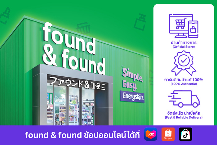 found & found มุ่งต่อยอดความสำเร็จจากหน้าร้านสู่โลกออนไลน์อย่างเต็มกำลัง พัฒนาแพลตฟอร์มอีคอมเมิร์ซ ให้เป็นหัวใจของกลยุทธ์ Omnichannel เพื่อเชื่อมต่อประสบการณ์ระหว่างออฟไลน์–ออนไลน์–โซเชียลคอมเมิร์ซสร้างอีโคซิสเท็มค้าปลีกความงามครบวงจรที่เชื่อมโยงทั้งผู้บริโภค พาร์ตเนอร์ และครีเอเตอร์ในยุคดิจิทัลโดยรวบรวมสินค้าความงามคุณภาพจากไทย ญี่ปุ่น และเกาหลีกว่า100แบรนด์ครอบคลุมตั้งแต่สกินแคร์ เมกอัพ ไปจนถึงผลิต ภัณฑ์ดูแลเส้นผมและสุขภาพ เพื่อให้ลูกค้าทุกคนสามารถเข้าถึงผลิตภัณฑ์แท้ได้ง่าย และคุ้มค่ากว่าที่เคย ภายใต้แนวคิด ‘SIMPLE. EASY. EVERYSKIN.’