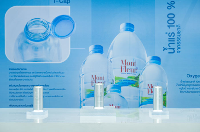 สำหรับบรรจุภัณฑ์ที่เปิดตัวในงาน ได้แก่ 1.น้ำแร่มองต์เฟลอ “น้ำแร่เติมก๊าซออกซิเจน (Oxygenated Mineral Water)” ในบรรจุภัณฑ์รูปแบบกระป๋องอะลูมิเนียมที่รีไซเคิลได้ 100% นับเป็นครั้งแรกของมองต์เฟลอกับการนำน้ำแร่จากแหล่งน้ำธรรมชาติที่มีความสมดุลต่อร่างกาย ซึ่งอุดมด้วยแร่ธาตุกว่า 8 ชนิด เช่น แคลเซียม แมกนีเซียม และไบคาร์บอเนต เป็นต้น โดยไม่มีการปรุงแต่งหรือเติมสารเคมีใด ๆ เพิ่มเติม รสชาตินุ่ม สดชื่น และสัมผัสเบา ดื่มง่าย ผ่านเทคโนโลยี O₂ Infusion Technology ที่ควบคุมแรงดันและอุณหภูมิอย่างแม่นยำ เพื่อให้ออกซิเจนละลายในน้ำได้ในระดับเหมาะสม ให้ความรู้สึกสดชื่น กระปรี้กระเปร่าในทุกครั้งที่ดื่ม บรรจุภัณฑ์ในรูปแบบกระป๋องที่ช่วยป้องกันแสงและอากาศจากภายนอก ทำให้คงคุณภาพของน้ำแร่ได้ยาวนานขึ้น ส่วนฝาห่วงที่ติดอยู่กับบรรจุภัณฑ์ช่วยให้ผู้บริโภคสามารถเปิดได้สะดวก และสามารถรีไซเคิลพร้อมกันได้ทั้งหมด และรีไซเคิลได้ไม่มีที่สิ้นสุด อีกทั้งเพิ่มอัตราการเก็บคืนและลดปริมาณขยะในสิ่งแวดล้อม