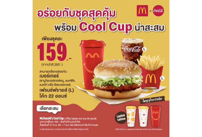 มาอร่อยกับ‘ชุดสุดคุ้ม’ จากเมนูเบอร์เกอร์สุดโปรด พร้อมสะสมแก้ว McDonald’s Cool Cup สุดลิมิเต็ด ให้ครบ ทั้ง 3 ดีไซน์ ได้แล้ว ตั้งแต่วันนี้ – 7 ธันวาคม 2568 ที่ร้านแมคโดนัลด์ทุกสาขาที่ร่วมรายการ, บริการแมคไดร์ฟ ทรู และแมคดิลิเวอรี โทร.1711, เว็บไซต์ www.mcdonalds.co.th หรือ รายละเอียดเพิ่มเติมที่ Facebook.com/McThai