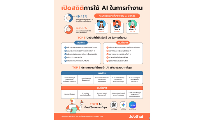 ผลสำรวจของ JobThai ยังชี้ว่า คนทำงาน 74.29% มีทัศนคติเชิงบวกต่อการใช้ AI โดยเห็นว่า AI ช่วยให้ทำงานง่ายขึ้น เร็วขึ้น และเปิดโอกาสให้เรียนรู้สิ่งใหม่ ๆ ขณะเดียวกัน 69.71% มองว่า AI มีส่วนทำให้คนตกงานบ้างในบางสายงาน แต่เป็นแรงกระตุ้นให้ต้องพัฒนา “ทักษะใหม่” แทนที่จะหลีกเลี่ยง