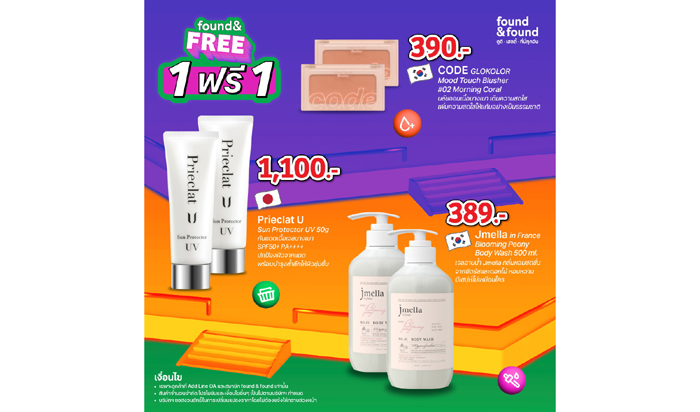 ใครอยากอัปเดตเทรนด์บิวตี้กับโปรโมชั่นสุดคุ้ม ซื้อ 1 ได้ถึง 2 ชิ้น ก็ไปเลือกช้อปกับบิวตี้ไอเทมยอดฮิตมากมายกันได้แบบจุใจ อาทิเช่น LuLuLun, BRINGGREEN คลีนซิ่งตัวท็อปจาก FIF เจลอาบน้ำ Jmella กันแดดอันดับหนึ่งจากญี่ปุ่น Pricelat U หรือแบรนด์อื่น ๆ อีกมากมาย เตรียมพร้อมช้อปฟินได้แล้วที่ร้าน found & found ทุกสาขา (ยกเว้นโซน found & found ใน Mitsukoshi และ Foodland) ตั้งแต่วันที่ 1-30 พฤศจิกายน 2568 เท่านั้น! ช้อปนี้มีแต่คุ้มรีบพุ่งตัวไปด่วน