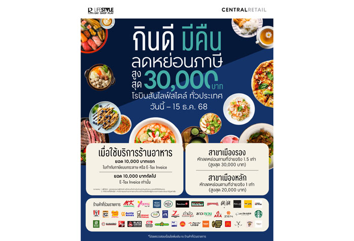 โรบินสันไลฟ์สไตล์ ขอเชิญชวนประชาชนทั่วประเทศร่วมใช้สิทธิ์ลดหย่อนภาษีในกิจกรรม “โรบินสันไลฟ์สไตล์ กินดี มีคืน” เพื่อสัมผัสประสบการณ์การกิน–ช้อป–ท่องเที่ยวสุดคุ้ม พร้อมมีส่วนร่วมกระตุ้นเศรษฐกิจไทยให้เติบโตอย่างยั่งยืนตลอดช่วงปลายปีนี้ โดยสามารถใช้สิทธิ์ได้ที่ร้านอาหารภายในศูนย์การค้าโรบินสันไลฟ์สไตล์ทั่วประเทศ ตั้งแต่วันที่ 29 ต.ค. 68 – 15 ธ.ค.68