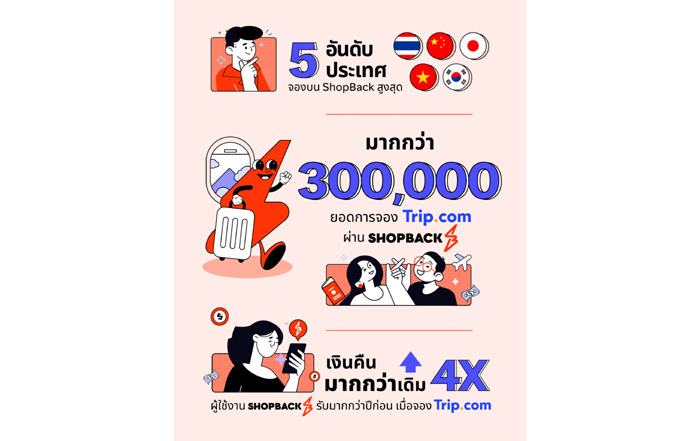 ShopBack แพลตฟอร์มช้อปปิ้งและรีวอร์ดโปรแกรมชั้นนำของเอเชีย ร่วมกับ Trip.com ผู้ให้บริการท่องเที่ยวระดับโลก เฉลิมฉลองความสำเร็จครบรอบหนึ่งปีของแคมเปญ “TripTastic” ซึ่งสร้างยอดการจองกว่า 300,000 รายการ บน Trip.com ผ่าน ShopBack ผู้ใช้งานได้รับแคชแบ็คมากกว่าเดิมถึงสี่เท่า ให้แก่นักเดินทางชาวไทย เมื่อเทียบกับช่วงเวลาเดียวกันของปีก่อน