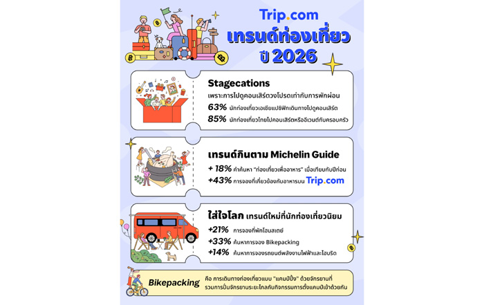 • “Stagecations” กำลังได้รับความนิยมในกลุ่มครอบครัว: Stagecation หรือการการท่องเที่ยวเพื่อชมความบันเทิงสดกำลังได้รับความนิยมเพิ่มขึ้น ปัจจุบันนักเดินทางในภูมิภาคเอเชียแปซิฟิกกว่า 63% เดินทางเพื่อชมคอนเสิร์ตหรือ่วมงานอีเวนต์ ขณะที่นักท่องเที่ยวชาวไทยถึง 85% มักผสมผสานทริปคอนเสิร์ตหรือเทศกาลเข้ากับการท่องเที่ยวพักผ่อนของครอบครัว โดยมีเมืองศูนย์กลางยอดนิยมอย่างมาเก๊า ลาสเวกัส เมลเบิร์น และสิงคโปร์เป็นจุดหมายหลัก