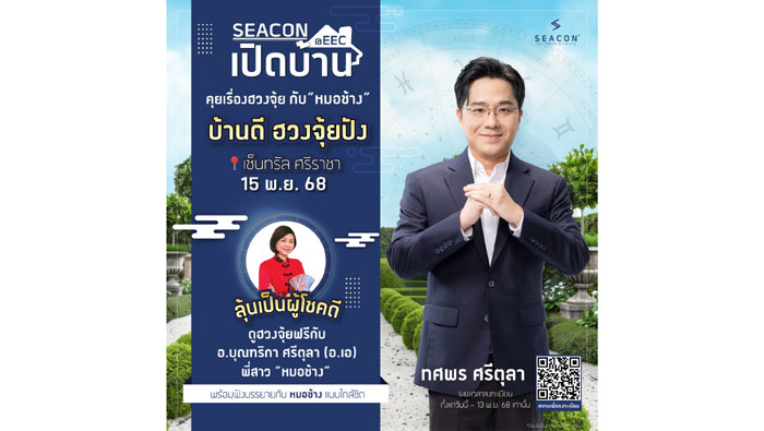 ทั้งนี้ งาน “SEACON เปิดบ้าน @EEC บ้านดี ฮวงจุ้ยปัง” เปิดให้ลงทะเบียนเข้าร่วมงานได้ตั้งแต่วันนี้ถึงวันที่ 14 พฤศจิกายน 2568 ผู้ลงทะเบียนล่วงหน้ามีสิทธิ์ลุ้นรับการดูฮวงจุ้ยบ้านฟรีกับ อ.บุณฑริกา ศรีตุลา (อ.เอ)
