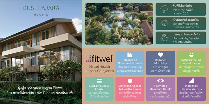 “โดยมาตรฐาน Fitwel นับเป็นเรื่องใกล้ตัวที่มุ่งเน้นการสร้างสภาพแวดล้อมที่ส่งเสริมด้านสุขภาพภายในอาคารและที่พักอาศัย เพื่อให้ที่พักอาศัย น่าอยู่ ปลอดภัย และเป็นมิตรต่อสุขภาพ ริเริ่มโดยกรมควบคุมโรคสหรัฐอเมริกา (CDC) วางเป้าหมายหลักเพื่อพัฒนามาตรฐานการออกแบบและการจัดการพื้นที่ที่เอื้อให้ผู้พักอาศัยมีสภาพแวดล้อมและคุณภาพชีวิตที่ดี ครอบคลุมทั้งสุขภาวะที่ดีทั้งกายและใจ ซึ่งการที่โครงการ ดุสิต อจารา หัวหิน นำมาตรฐาน Fitwel: Low Rise Residential มาใช้ตั้งแต่เริ่มต้นการออกแบบและพัฒนาจะเป็นการสร้างบรรทัดฐานให้กับโครงการฯ และเป็นการเซ็ตการสร้างมาตรฐานของสภาพแวดล้อมที่เต็มเปี่ยมด้วยสุขภาวะที่ดีทั้งกายและใจ และยกระดับคุณภาพชีวิตของผู้พักอาศัย ภายใต้แนวคิด 7 ด้าน ได้แก่