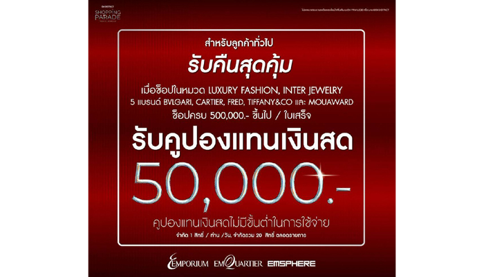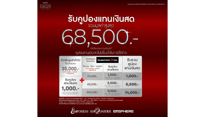 สำหรับในช่วงเดือนพฤศจิกายนของทุกๆ ปี ถือเป็นช่วงก่อนเข้าสู่ Festive Season ที่ผู้บริโภคมีความตื่นตัวในการใช้จ่ายเพิ่มมากขึ้นเนื่องจากเป็นช่วงที่ภาคธุรกิจต่างเริ่มโฟกัสในการทำการตลาดกระตุ้นอารมณ์การบริโภคของลูกค้าในช่วงโค้งสุดท้ายของการทำธุรกิจในปี 2568 ในส่วนของ เอ็ม ดิสทริคเอง ได้มีการจัดโปรโมชันอย่างต่อเนื่องมาโดยตลอด เพื่อรองรับกำลังซื้อของลูกค้า โดยล่าสุดได้จับมือกับหลากหลายพันธมิตรธุรกิจจัดแคมเปญ EM DISTRICT SHOPPING PARADE ตั้งแต่วันนี้ – 26 พฤศจิกายน 2568 ช้อปปิ้งใน 3 ศูนย์การค้าตามเงื่อนไขผ่านบัตรเครดิต Bangkok Bank M Visa รับคูปองแทนเงินสดสูงสุด 68,500 บาท พิเศษ! รับคืนแบบสุดคุ้ม เมื่อช้อปในหมวด LUXURY FASHION และ INTERNATIONAL JEWELRY ครบ 500,000 บาทขึ้นไปรับทันทีคูปองแทนเงินสด 50,000 บาท