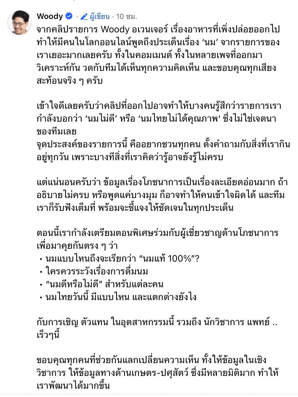 หลังจากที่นักวิชาการออกมาโต้แย้ง ทำให้วู้ดดี้ได้ออกมาชี้แจงว่า ความตั้งใจคือ “ชวนทุกคนตั้งคำถามกับสิ่งที่เรากินอยู่ทุกวัน” ไม่ได้ตั้งใจทำให้รู้สึกว่า นมไทยด้อยคุณภาพ และขอระงับการเผยแพร่คลิปชั่วคราว รวมถึงกำลังเตรียมตอนพิเศษร่วมกับผู้เชี่ยวชาญด้านโภชนาการ แพทย์ และตัวแทนจากอุตสาหกรรมนมไทย เพื่อพูดคุยกันอย่างตรงไปตรงมาในทุกประเด็น