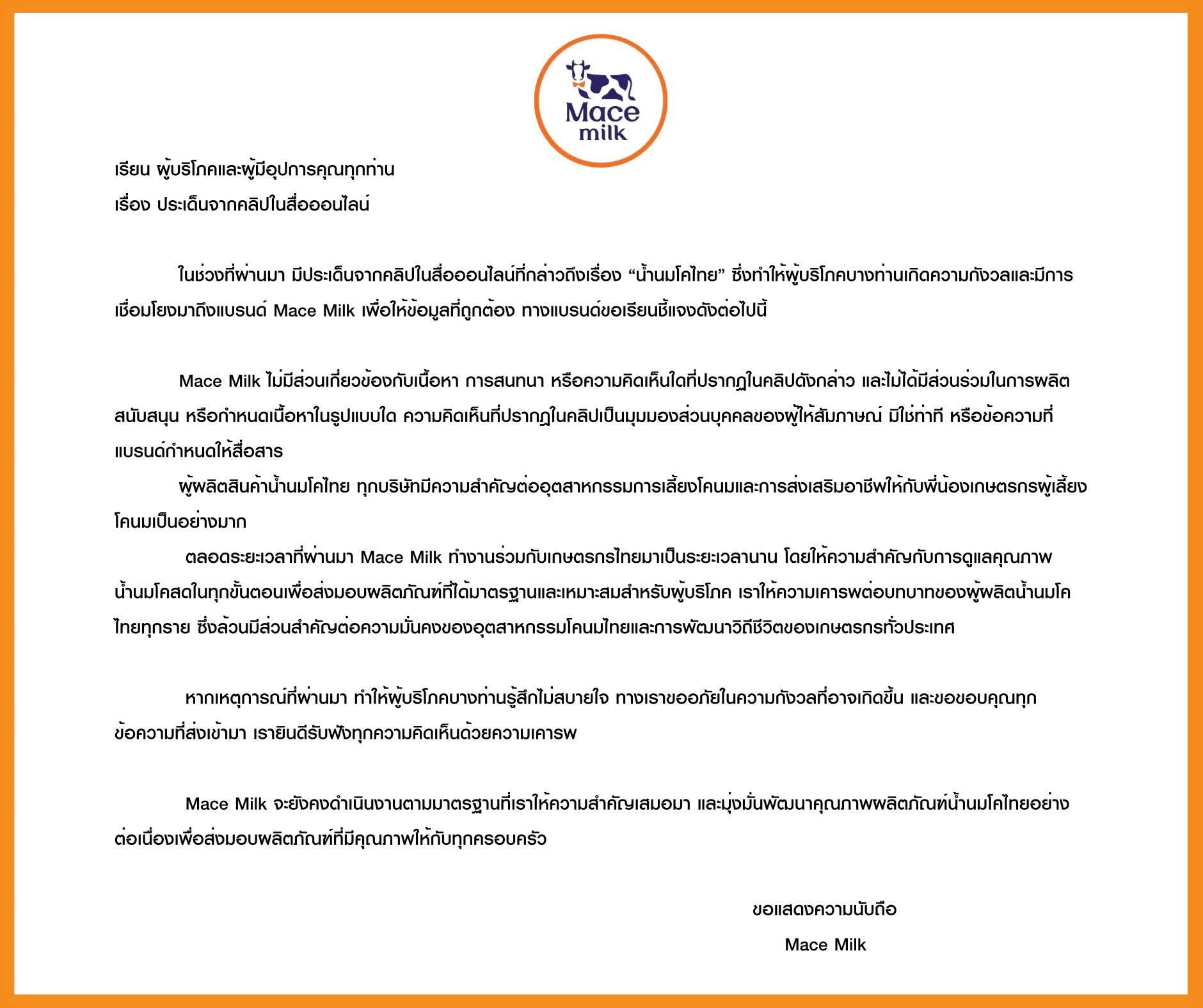 โดยหลังจากที่ดราม่าถูกเชื่อมโยงมาถึงตัวแบรนด์ ทาง Mace Milk ก็ได้ออกมาชี้แจงผ่าน Facebook page ว่า ไม่มีส่วนเกี่ยวข้องกับเนื้อหาที่ปรากฏในคลิป