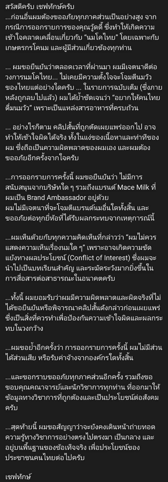 ขณะที่ด้าน เชฟทักษ์ ก็ออกมาขอโทษที่เนื้อหาที่ถูกตัดมาอาจทำให้สังคมเข้าใจผิด พร้อมกับย้ำว่า อยากให้คนไทยดื่มนมวัว เพราะเป็นแหล่งสารอาหารที่ครบถ้วน เช่นเดียวกับ เมย์-ศวิตา ที่ระบุว่า เจตนารมณ์เพียงอยากให้คนตระหนักถึงคุณภาพและแหล่งที่มาของอาหารที่บริโภค พร้อมกันนี้ยินดีและเต็มใจช่วยเหลือเกษตรกรโคนมไทย และการให้ข้อมูลในรายการดังกล่าวเป็นการเล่าจากประสบการณ์ส่วนตัว ไม่ได้มีสปอนเซอร์นมวัวใด ๆ เข้ามาเกี่ยวข้อง