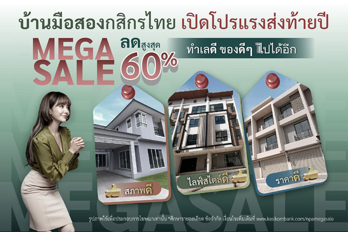 ธนาคารกสิกรไทยจัดโปรแรงส่งท้ายปี บ้านมือสองกสิกรไทย ให้ลูกค้าทั้งกลุ่มคนอยากมีบ้าน เจ้าของกิจการหรือนักลงทุนอสังหาริมทรัพย์ กับแคมเปญใหญ่ Mega Sale ลดสูงสุด 60% คัดสรรทรัพย์คุณภาพทั่วประเทศ ทั้งบ้านเดี่ยว ทาวน์โฮม คอนโดมิเนียม และอาคารพาณิชย์ ราคาดี ทำเลดี และสภาพดี กับบ้านมือสองกสิกรไทย ของดี ๆ ไปได้อีก พร้อมสิทธิพิเศษ ฟรีค่าโอนสูงสุด 300,000 บาท* และกู้ได้สูงสุด 110%**