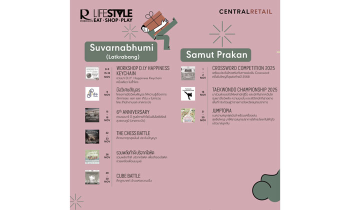 ศูนย์การค้าโรบินสันไลฟ์สไตล์ ในเครือเซ็นทรัล รีเทล เชิญชวนทุกคนร่วมสัมผัสช่วงเวลาแห่งการให้ส่งต่อความสุขและโมเมนต์ดีๆ ปลายปี ผ่านหลากหลายกิจกรรมกว่า 100 อิเวนต์ทุกสาขาทั่วประเทศ ตลอดเดือนพฤศจิกายน 2568 อาทิ การบริจาคโลหิตเพื่อช่วยเหลือชีวิตเพื่อนมนุษย์ เทศกาลอาหารอร่อยจากทั่วไทย เวิร์กชอปสร้างสรรค์ กิจกรรมกับสัตว์เลี้ยงน่ารัก และเวทีแสดงความสามารถของเยาวชน ตอกย้ำพื้นที่แห่งการเป็นศูนย์กลางชีวิตของทุกคน หรือ Central to Life ที่มุ่งมอบประสบการณ์ที่อบอุ่นและประทับใจในกับทุกท่านในทุกครั้งที่มาใช้บริการ