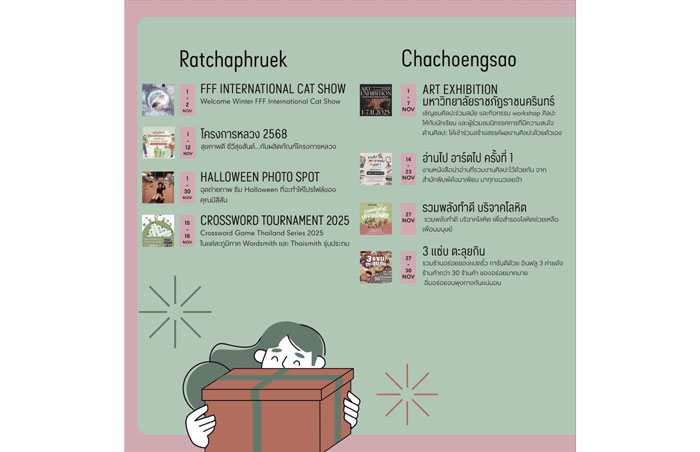 1 พ.ย.68–7 พ.ย. 68 เชิญชม Art Exhibition โดยมหาวิทยาลัยราชภัฏราชนครินทร์ ที่รวบรวมผลงานศิลปะร่วมสมัยของนักศึกษา พร้อมกิจกรรม Workshop ศิลปะให้ผู้ร่วมชมได้ทดลองสร้างสรรค์ผลงานด้วยตนเอง สัมผัสพลังแห่งความคิดสร้างสรรค์ที่เชื่อมโยงชุมชนกับศิลปะอย่างงดงาม