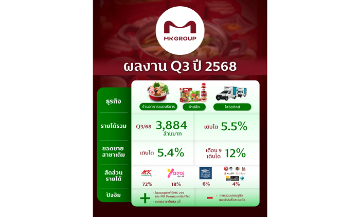 หลังจาก MK ส่งบุฟเฟต์ลุยตลาด ทั้ง “MK คุ้มเกินคุ้ม 299 บาท” และ “MK Premium Buffet” ส่งผลให้ยอดขายรวม ไตรมาส 3 ปี 2568 เติบโตขึ้นอย่างมีนัยสำคัญ โดยมีเทรนด์การเติบโตขึ้นต่อเนื่องในทุกไตรมาสตั้งแต่ต้นปี ซึ่งช่วยเสริมความแข็งแกร่งให้กับภาพรวมของกลุ่มในปีนี้