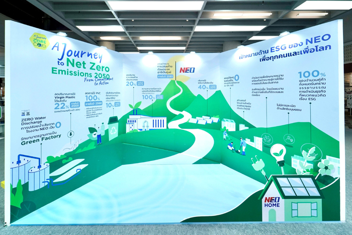 1.A Journey to Net Zero Emissions: ตอกย้ำคำมั่นสัญญาและเป้าหมายที่ชัดเจนของ NEO ในการมุ่งสู่การปล่อยก๊าซเรือนกระจกสุทธิเป็นศูนย์ ภายในปี พ.ศ. 2593 (Net Zero Pathway) โชว์ความคืบหน้าสำคัญ เช่น การปล่อยน้ำเสียจากโรงงานเป็นศูนย์ (ZERO Water Discharge), การลดใช้ PVC ให้ได้ 100% ภายในปี 2568, และความสำเร็จในการลดการใช้ Virgin Plastic ได้แล้วถึง 22% ซึ่งเร็วกว่าเป้าหมายที่วางไว้