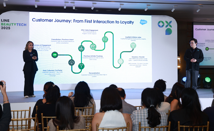 เวทีนี้ยังได้รวมผู้นำจากแบรนด์ดังระดับโลกและในไทยอย่าง ลอรีอัล กรุ๊ป และ ศรีจันทร์ ร่วมถ่ายทอดกลยุทธ์สร้าง Brand Love บน LINE โดยลอรีอัล เน้นกลยุทธ์สร้างความเชื่อมั่นผ่านนวัตกรรมและความเชื่อใจ จากตัวอย่างแคมเปญ Skin Analyzer และบริการ Beauty Consultant ผ่านแชต 1:1 บน LINE OA ช่วยให้ลูกค้าได้รับ คำแนะนำผลิตภัณฑ์เฉพาะบุคคลตรงตามปัญหาผิวจริงอย่างใกล้ชิด ในขณะที่ศรีจันทร์เลือกใช้ LINE OA เป็นศูนย์ กลางสร้างความสัมพันธ์กับลูกค้าแบบเรียลไทม์ผ่านระบบ Srichand Rewards ที่มีสมาชิกเพิ่มขึ้นกว่า 100,000 รายในช่วง 3 เดือน และสามารถเพิ่ม Engagement ได้ถึง 350% ด้วยการสื่อสารแบบ Personalized ผ่าน LINE OA