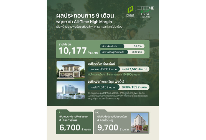 นายธีระ ทองวิไล ประธานเจ้าหน้าที่บริหาร บริษัท พฤกษา เรียลเอสเตท จำกัด (มหาชน) กล่าวถึงธุรกิจอสังหาริมทรัพย์ว่า ผลประกอบการ 9 เดือนแรก ทำยอดขายได้ 9,256 ล้านบาท ยอดโอน 7,561 ล้านบาท มีการเปิดโครงการใหม่รวม 11 โครงการ มูลค่า 10,800 ล้านบาท โดยยังมีที่อยู่อาศัยพร้อมขายอีก รวมมูลค่า 66,200 ล้านบาท โดยในไตรมาส 4 มีแผนเปิดตัวโครงการใหม่ 6 โครงการ รวมมูลค่ากว่า 6,700 ล้านบาท ครอบคลุมทั้งแนวราบและคอนโดมิเนียม ได้แก่ เดอะปาล์ม คอร์ทยาร์ด บางนา กม.8 บ้านหรูคอร์ทยาร์ดวิลล่า, เดอะปาล์ม วิภาวดี 64 บ้านหรู 3 ชั้น ในสังคมส่วนตัวเพียง 19 ยูนิต ผสานบริการจากโรงพยาบาลวิมุตในแนวคิด “Wellness Living”, และ โครงการเดอะ รีเซิร์ฟ วิลล่า สุขุมวิท 89/1 ที่ลงทุนร่วมกับกองทุน C-Well ออกแบบโดยทีมสถาปนิก A49 ซึ่งเป็นหนึ่งในโครงการระดับ Flagship ของกลุ่ม, สำหรับบ้านในกลุ่มตลาดระดับกลาง จะเปิดตัวโครงการภัสสร ศรีนครินทร์ – เทพารักษ์ บ้านเดี่ยวพรีเมียม พร้อมคลับเฮาส์ และสวน “Sensory Park” สำหรับครอบครัวและสัตว์เลี้ยง ขณะที่กลุ่มคอนโดมิเนียมเปิดโครงการ พลัม คอนโด อีสต์ ลาดพร้าว ใกล้ MRT ลาดพร้าว 83 เพียง 250 เมตร ราคาเริ่มต้น 1.88 ล้านบาท ตอบโจทย์กลุ่มคนรุ่นใหม่ในเมือง โดยยังคงมุ่งสู่เป้าหมายการเป็นองค์กรแห่งคุณภาพชีวิตภายใต้แนวคิด “Lifetime Well-Living” เชื่อมโยง 3 เสาหลัก Well Home – Well Care – Well Community เพื่อยกระดับมาตรฐานการอยู่อาศัยของคนไทยในระยะยาว พร้อมตอกย้ำภาพลักษณ์การอยู่อาศัยที่ “อยู่ดี ทั้งชีวิต”