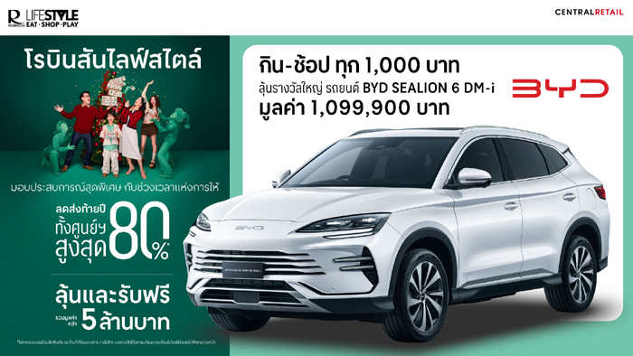 ร่วมเป็นส่วนหนึ่งของประสบการณ์แห่งความสุขส่งท้ายปี กับแคมเปญ “โรบินสันไลฟ์สไตล์ มอบประสบการณ์พิเศษ กับช่วงเวลาแห่งการให้” เพียงช้อปครบตามเงื่อนไข รับสิทธิ์ลุ้นรางวัลใหญ่รถยนต์ปลั๊กอินไฮบริด BYD รุ่น SEALION 6 DM-i มูลค่า 1.09 ล้านบาท พร้อมดีลสุดคุ้มจากหลากหลายร้านค้า ตั้งแต่วันนี้ – 4 ม.ค. 69 ที่ศูนย์การค้าโรบินสันไลฟ์สไตล์ทุกสาขา ทั่วประเทศ