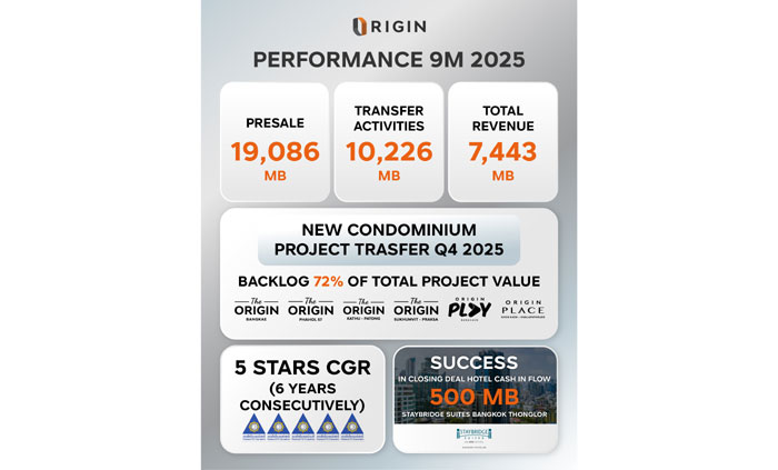 นายพีระพงศ์ จรูญเอก ประธานเจ้าหน้าที่บริหาร บริษัท ออริจิ้น พร็อพเพอร์ตี้ จำกัด (มหาชน) หรือ ORI ผู้พัฒนาธุรกิจอสังหาริมทรัพย์ครบวงจร เปิดเผยว่า ผลการดำเนินงานในช่วง 9 เดือนแรกของปี 2568 บริษัทฯ มีรายได้จากการโอนกรรมสิทธิ์โครงการที่อยู่อาศัยทุกกลุ่ม (รวมโครงการร่วมทุน) ทั้งสิ้นกว่า 10,226 ล้านบาท โดยแบ่งเป็นโครงการที่บริษัทฯพัฒนาเอง 4,529 ล้านบาท และโครงการร่วมทุน 5,697 ล้านบาท ส่งผลให้มีรายได้รวม 9 เดือน 7,443 ล้านบาท และสามารถทำยอดขายบ้านและคอนโดมิเนียมได้กว่า 19,086 ล้านบาท แบ่งเป็นยอดขายจากโครงการคอนโดฯ ประมาณ 81% และยอดขายจากโครงการบ้านจัดสรร ประมาณ 19% โดยยอดขายดังกล่าวมาจากกลุ่มโครงการพร้อมอยู่ (Ready to move) ประมาณ 60% และยอดขายจากกลุ่มโครงการที่เปิดขายใหม่ (New Launch) และอยู่ระหว่างดำเนินการก่อสร้าง (Ongoing) รวมกันประมาณ 40% ทำให้ยอดขายรอรับรู้รายได้ (Backlog) ณ สิ้นไตรมาส 3/2568 รวมอยู่ที่ 40,980 ล้านบาท ทยอยรับรู้รายได้ต่อเนื่อง 4 ปี