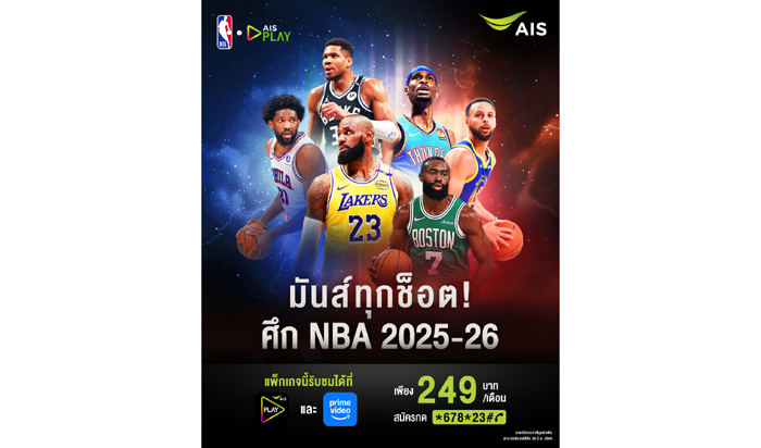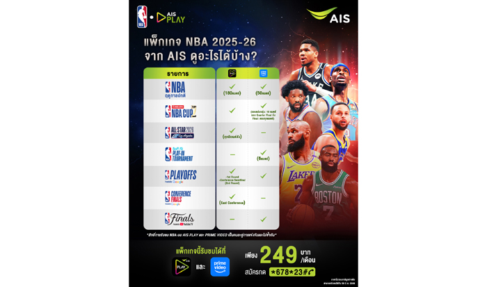 AIS PLAY จับมือกับ Prime Video ตอกย้ำการเป็นศูนย์กลางความบันเทิงและกีฬาอันดับ 1 ของประเทศไทย มอบประสบการณ์การรับชมการแข่งขันบาสเก็ตบอลที่ยิ่งใหญ่ระดับโลกแก่ลูกค้าเอไอเอส ผ่านการถ่ายทอดสดแมตช์สำคัญ ที่สามารถรับชมได้บน Prime Video เท่านั้น เติมเต็มคอนเทนต์ NBA ฤดูกาล 2025-26 แมตช์ รวมมากกว่า 290 แมตช์ ด้วยแพ็กเกจ “NBA 2025-26” ในราคาเพียง 249 บาทต่อเดือน (ไม่รวม VAT) ตอบโจทย์ไลฟ์สไตล์ของคนรักกีฬาและคอสตรีมมิง ให้สามารถรับชมศึกบาสระดับโลก พร้อมด้วยความบันเทิงระดับพรีเมียมในราคาสุดคุ้ม ด้วยการรวมสิทธิ์การถ่ายทอดสด NBA จากทั้ง AIS PLAY และ Prime Video ให้แฟนบาสเกตบอลได้สัมผัสทุกแมตช์สำคัญ พร้อมบรรยายไทยเต็มอรรถรส เสริมด้วยความบันเทิงระดับโลกจาก Prime Video Video ให้คอกีฬายุคใหม่ได้สนุก ตื่นเต้น ครอบคลุมยิ่งขึ้น และรับชมได้ทุกที่ ทุกเวลา