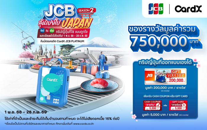 CardX ผู้นำด้านนวัตกรรมบัตรเครดิตภายใต้กลุ่ม SCBX ผนึกกำลัง JCB ส่งแคมเปญใหญ่ “JCB ลุ้นเปย์ไปเจแปน Season 2” ชวนลูกค้าบัตรเครดิต CardX JCB Platinum ออกเดินทางสู่ประสบการณ์ที่ใช่แบบ “ญี่ปุ่นในฝัน” พร้อมลุ้นของรางวัลรวมมูลค่า 750,000 บาท เพียงใช้จ่ายผ่านบัตร ครบ 500 บาทขึ้นไป/เซลล์สลิป รับ 1 สิทธิ์ลุ้น พร้อมลงทะเบียนร่วมรายการผ่าน SMS ตั้งแต่วันที่ 1 พฤศจิกายน 2568 – 28 กุมภาพันธ์ 2569