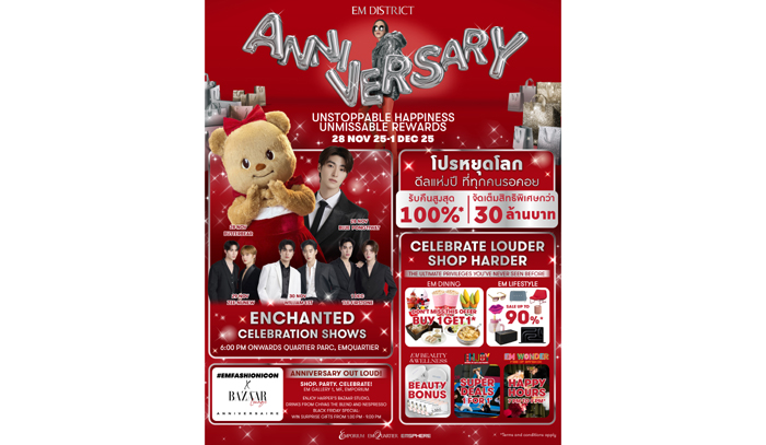 เอ็ม ดิสทริค (เอ็มโพเรียม, เอ็มควอเทียร์, เอ็มสเฟียร์) จับมือกว่า 30 พันธมิตร สร้างปรากฏการณ์ครั้งยิ่งใหญ่จัดงาน EM DISTRICT ANNIVERSARY: UNSTOPPABLE HAPPINESS UNMISSABLE REWARDS และ “EM DISTRICT WINTER WONDERLAND” ระหว่างวันที่ 27 พฤศจิกายน ถึง วันที่ 5 มกราคม 2569 – เฉลิมฉลองครบรอบ 2 ปีแห่งความสำเร็จ ในการเป็นย่านการค้าระดับโลกที่เติมเต็มความสมบูรณ์แบบของกรุงเทพมหานคร สร้างความสุขรับเทศกาลคริสต์มาสและปีใหม่ ด้วยการทุ่มงบประมาณกว่า 200 ล้านบาท จัดอภิมหาแคมเปญโปรโมชั่นมอบของรางวัลรวมกว่า 30 ล้านบาท พร้อมด้วยอีเวนต์สุดยิ่งใหญ่ ตระการตา ยาวนานกว่า 1 เดือนเต็ม ตอกย้ำภาพลักษณ์การเป็นหนึ่งในศูนย์กลางไลฟ์สไตล์ และ ENTERTAINMENT HUB ระดับโลก ที่เป็นเดสทิเนชั่นของนักท่องเที่ยวทั่วโลก