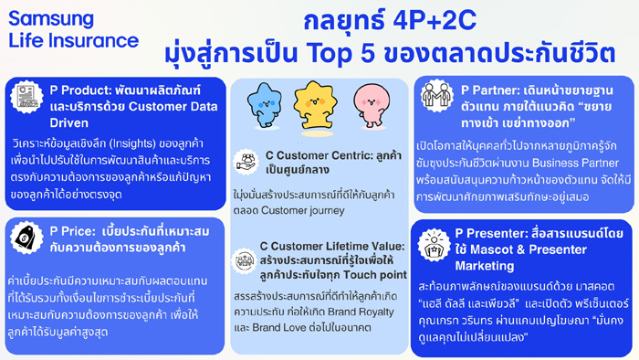 คุณศิริพร ศิริวัฒนกุล ประธานเจ้าหน้าที่สายงานกลยุทธ์การตลาด บริษัท ซัมซุงประกันชีวิต (ประเทศไทย) จำกัด (มหาชน) เปิดเผยว่า “ปัจจุบันมียอดขายใหม่อยู่ที่ 186.18 ล้านบาท และกำไรก่อนหักภาษีมากกว่า 58.54 ล้านบาท (ตัวเลข ณ สิ้นเดือนตุลาคม) คาดการณ์ว่าไตรมาสสุดท้ายในปีนี้ จะมีเบี้ยประกันภัยรับรวมประมาณ 820 ล้านบาท น่าจะส่งผลให้ในปี 2568 ทำได้ 2,520 ล้านบาท และคาดว่าจำนวนลูกค้าเพิ่มขึ้น 14% จากปี 2567 ทั้งจากช่องทางตัวแทนและ Bancassurance สะท้อนให้เห็นว่าบริษัทฯ มีการเติบโตอย่างต่อเนื่อง ทั้งในด้านยอดขายและกำไร ทั้งนี้บริษัทฯ ตั้งเป้าเพิ่มขึ้นเป็น 3,779 ล้านบาท เติบโตมากกว่า 150% จากปี 2568 ความสำเร็จทั้งหมดจะมาจากแผนกลยุทธ์ 4P+2C ที่จะขับเคลื่อนธุรกิจเพื่อพาซัมซุงประกันชีวิตไปสู่การเป็น Top 5 ของตลาดประกันชีวิต และสร้างการเติบโตอย่างยั่งยืน อันประกอบไปด้วย