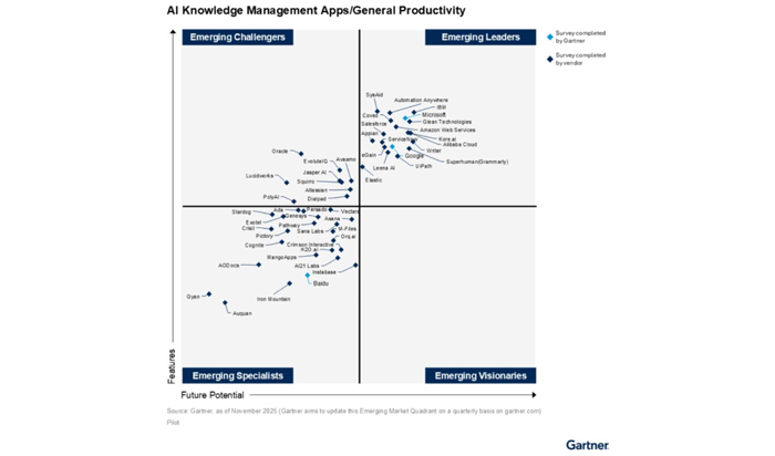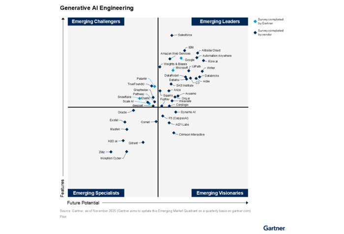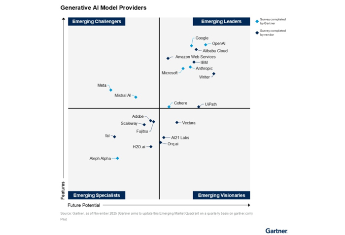 Gartner ระบุว่า Emerging Market Quadrant คือ “การจัดวางตำแหน่งผู้ให้บริการด้าน generative AI” ใน “ตลาดที่มีพลวัตและเคลื่อนไหวอย่างรวดเร็ว” และโดยทั่วไป “Emerging Leader มักเป็นผู้ให้บริการที่เป็นที่รู้จักในตลาดที่มาพร้อมคุณสมบัติต่าง ๆ ที่แข็งแกร่งและมีศักยภาพในอนาคต”