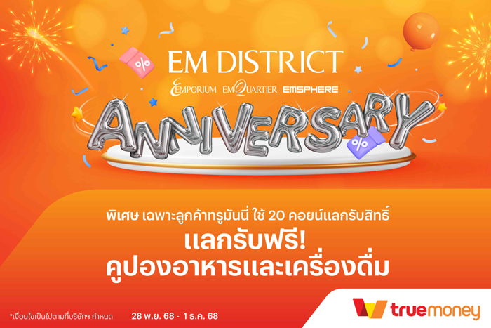 ทรูมันนี่ ผู้นำด้านบริการอิเล็กทรอนิกส์เพย์เมนท์และผู้ให้บริการทางการเงินชั้นนำในภูมิภาคเอเชียตะวันออกเฉียงใต้ ร่วมเฉลิมฉลองโอกาสครบรอบ 2 ปีของ เอ็ม ดิสทริค (EM DISTRICT) ย่านการค้าระดับโลกใจกลางกรุงเทพฯ ในงาน “EM DISTRICT ANNIVERSARY: UNSTOPPABLE HAPPINESS UNMISSABLE REWARDS” มอบสิทธิพิเศษสุดเอกซ์คลูซิฟให้กับลูกค้าทรูมันนี่ แลกรับคูปองอาหารและเครื่องดื่มจากร้านค้าที่ร่วมรายการ เพียงใช้ทรูมันนี่ คอยน์ 20 คอยน์ ก็สามารถเพลิดเพลินกับมื้ออาหารสุดพิเศษท่ามกลางบรรยากาศย่านการค้าสุดทันสมัยได้ง่าย ๆ สะท้อนความมุ่งมั่นของทรูมันนี่ในการยกระดับประสบการณ์การใช้จ่ายดิจิทัลที่สะดวก คุ้มค่า และตอบโจทย์ไลฟ์สไตล์ของผู้บริโภคได้อย่างครอบคลุม