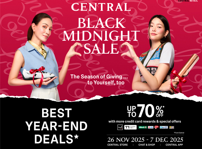 ห้างเซ็นทรัล ในเครือเซ็นทรัล รีเทล ต้อนรับเทศกาลแห่งการ “ให้” ปลายปี 2568 จัดแคมเปญ “Central Black Midnight Sale – The Season of Giving … to Yourself, too เทศกาลแห่งการให้…ตัวเองบ้างก็ได้” อัดดีลพิเศษสุดคุ้มค่า “Best Year – End Deals ; ดีลที่ดีที่สุด ส่งท้ายปี” ลดสูงสุด 70% เริ่ม 26 พ.ย. 68 – 7 ธ.ค. 68 ทั้งในห้างเซ็นทรัล – ออนไลน์ และช่องทางโซเชียลมีเดีย ตั้งเป้าโกยยอดขายจากแคมเปญเพิ่ม 15% ใน 12 วัน หนุนปิดไตรมาส 4/2568 อย่างสมบูรณ์แบบ