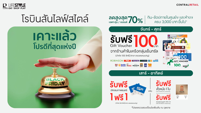 ศูนย์การค้าโรบินสันไลฟ์สไตล์ ในเครือเซ็นทรัล รีเทลชวนขาช้อปมาสนุกกับทุกโมเมนต์แห่งการให้ช่วงสิ้นเดือนพฤศจิกายนนี้กับแคมเปญ“Black Friday เคาะแล้วโปรดีที่สุดแห่งปี” ที่ออกแบบมาให้ตอบโจทย์ทุกไลฟ์สไตล์ของลูกค้าส่งมอบความคุ้มค่าให้สายช้อปทั่วประเทศได้เพลิดเพลินกับสิทธิพิเศษสุดคุ้ม สินค้าทั้งศูนย์การค้าฯ ทั้งห้างฯ ลดสูงสุด 70% (เฉพาะรุ่น / เฉพาะแบรนด์) ทั้งของรางวัลและโปรโมชันพิเศษมากมาย ทั้งช้อป กิน และสนุกกับความบันเทิงครบจบในที่เดียวตั้งแต่วันที่ 25 พ.ย. 68 – 3 ธ.ค. 68 ที่โรบินสันไลฟ์สไตล์ทุกสาขาทั่วประเทศ