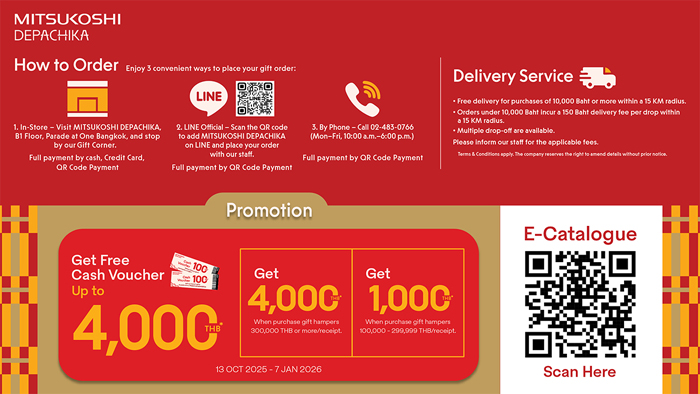 ร่วมสัมผัสประสบการณ์ใหม่ของการมอบกระเช้าของขวัญในช่วงเทศกาลปีใหม่ ที่ผสานความคิดสร้างสรรค์และความพิถีพิถันเข้าด้วยกันอย่างลงตัว ด้วยคอลเลคชันพิเศษ “New Year Hamper – GIFT FROM THE HEART” ครั้งแรกจากมิตซูโคชิ เดปาจิกะ ได้แล้วตั้งแต่วันนี้ ถึงวันที่ 7 มกราคม2568 ผ่าน 3 ช่องทาง ได้แก่ มิตซูโคชิ เดปาจิกะ B1 ตึกพาเหรด โครงการวัน แบงค็อก หรือ Line@MitsukoshiDPCKTHหรือสั่งซื้อทางโทรศัพท์ (เฉพาะจันทร์ – ศุกร์ เวลา 10.00 – 18.00 น.) โทร 094 830 766 พิเศษ! จัดส่งฟรีเมื่อซื้อสินค้าครบ 10,000 บาทขึ้นไป (ในระยะทางไม่เกิน 15 กิโลเมตร)