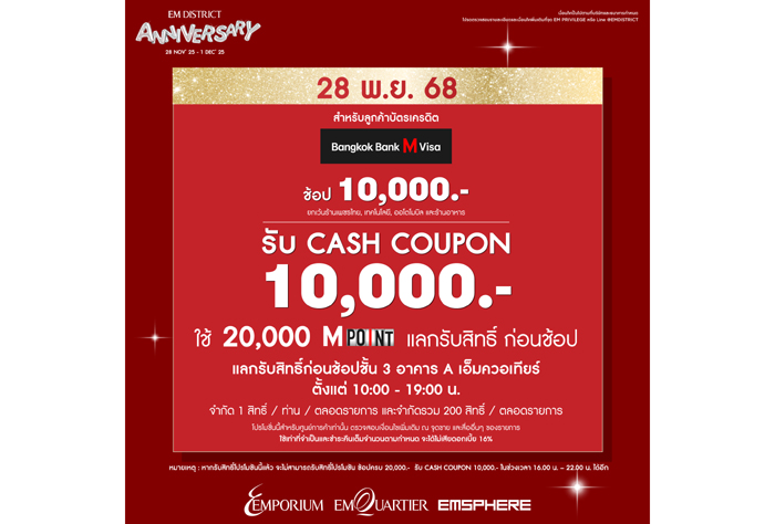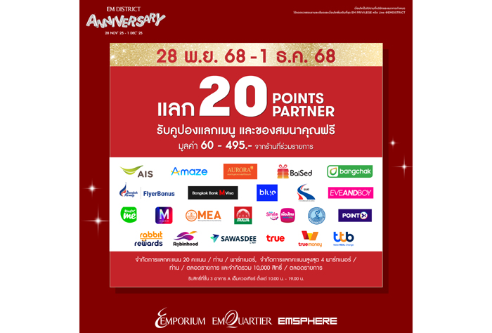 EM DISTRICT ANNIVERSARY UNSTOPPABLE HAPPINESS UNMISSABLE REWARDS มอบความพิเศษฉลองโอกาสครบรอบ 2 ปีพร้อมหลากหลายสิทธิพิเศษสุดเอ็กซ์คลูซีฟตลอด 4 วันเต็ม ระหว่างวันที่ 28 พฤศจิกายน 2568–1 ธันวาคม 2568 โดยการนำคะแนนจากพันธมิตรธุรกิจกว่า 23 พันธมิตรที่ร่วมแคมเปญ 20 คะแนน แลกรับของสมนาคุณ หรือเมนูฟรีจากร้านอาหารชั้นนำในศูนย์การค้ามากมาย”