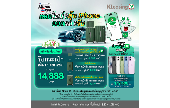 ลีสซิ่งกสิกรไทยมอบข้อเสนอสุดพิเศษส่งท้ายปีในงานมหกรรมยานยนต์ Motor Expo 2025 ครั้งที่ 42 ให้ลูกค้าที่ แอดไลน์ @kleasingofficial ลุ้นรับไอโฟน 17 จำนวน 6 เครื่อง และลูกค้าที่สมัครสินเชื่อรถยนต์ใหม่ในงานรับกระเป๋าเดินทางยกเซต พร้อมชูความเป็นผู้นำด้านการให้สินเชื่ออย่างรับผิดชอบและเป็นธรรม (Responsible Lending) ด้วย “K OK” แพลตฟอร์มสมัครสินเชื่อรถยนต์ด้วยตนเอง ที่ช่วยให้ลูกค้าทราบผลวงเงินอนุมัติจริงก่อนออกรถ ตั้งเป้าปริมาณยอดธุรกิจผ่านช่องทางดิจิทัลสูงกว่า 50%