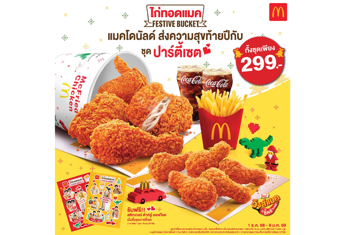 แมคโดนัลด์ ร่วมฉลองเทศกาลแห่งความสุขส่งท้ายปีกับไก่ทอดแมคชุดพิเศษ ให้ทุกคนได้มาแชร์กันกับ ‘บักเก็ต สุขเต็มถัง’ จัดเต็มไก่ทอดแมค กรอบ ฉ่ำถึงใจ อร่อยถึงเนื้อ คุ้มสุดๆ ทุกงานปาร์ตี้ ในชุดประกอบด้วย ไก่ทอดแมค 4 ชิ้น, วิงส์แมคซี้ดซ้าด 5 ชิ้น, เฟรนซ์ฟรายส์ ขนาดกลาง 1 กล่อง และ โค้ก ขนาด 16 ออนซ์ 2 แก้ว ราคาเพียง 299 บาท และสำหรับกรุ๊ปใหญ่ห้ามพลาด! ‘บักเก็ตปาร์ตี้ฟินเวอร์’ ยิ่งแชร์ยิ่งคุ้ม ปาร์ตี้สนุก อิ่มอร่อย กับไก่ทอดแมคถึง 5 ชิ้น แมคนักเก็ต 10 ชิ้น ปาร์ตี้ฟรายส์ ใหญ่เวอร์ 1 กล่อง และ โค้ก ขนาด 16 ออนซ์ 2 แก้ว ราคาเพียง 399 บาท