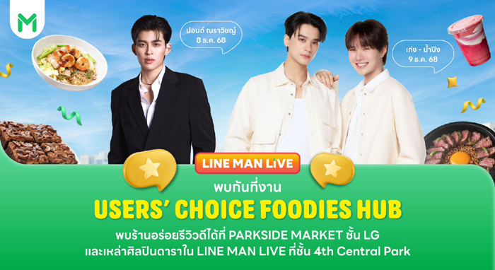 LINE MAN Wongnai ปักหมุด Central Park แลนด์มาร์กความอร่อยแห่งใหม่ สร้างสีสันส่งท้ายปีเก่า–ต้อนรับปีใหม่ ผ่านแคมเปญ “LINE MAN Wongnai Users’ Choice x Central Park FOODIES HUB” กับการเทกโอเวอร์พื้นที่ PARKSIDE MARKET ชั้น LG ณ ศูนย์การค้า Central Park นานกว่า 4 เดือน รวบรวมกว่า 50 ร้านรางวัล Users’ Choice ร้านอร่อยรีวิวดีจากนักกินตัวจริงทั่วไทย ตั้งแต่วันที่ 1 ธันวาคม 2568 – 31 มีนาคม 2569 พร้อมมอบความสะดวกครบทุก Touch Point ทั้งสั่ง Delivery ผ่าน LINE MAN หรือจะอร่อยหน้าร้านด้วย Pick & Go และเดินทางมาชิมพร้อมสัมผัสประสบการณ์ถึงที่ด้วยบริการเรียกรถ LINE MAN RIDE