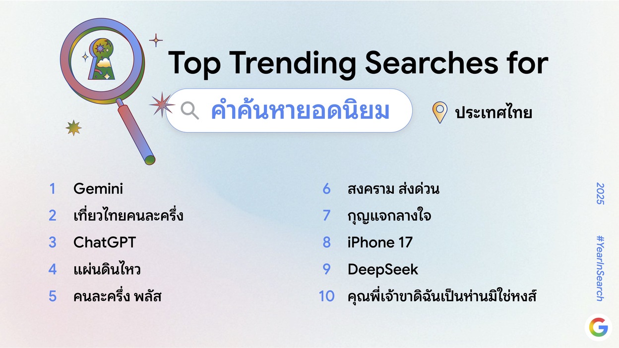 ผลการค้นหายอดนิยมปีนี้สะท้อนให้เห็นถึงการผสานกันของเทรนด์เทคโนโลยี เหตุการณ์สังคม และความบันเทิงที่ต่างมีบทบาทสำคัญในการขับเคลื่อนความสนใจของคนไทยตลอดทั้งปี โดยเฉพาะด้านเทคโนโลยีซึ่งยังคงโดดเด่นที่สุดในปีนี้ โดย “Gemini” ครองอันดับ 1 คำค้นหายอดนิยมประจำปี 2568 นอกจากนี้ “ChatGPT” และ “DeepSeek” ก็ติดโผ 10 อันดับแรกเช่นเดียวกัน ในด้านนโยบายภาครัฐที่เกี่ยวข้องกับไลฟ์สไตล์และความเป็นอยู่ของประชาชนอย่าง “เที่ยวไทยคนละครึ่ง” และ “คนละครึ่ง พลัส” ยังคงได้รับความสนใจอย่างต่อเนื่อง