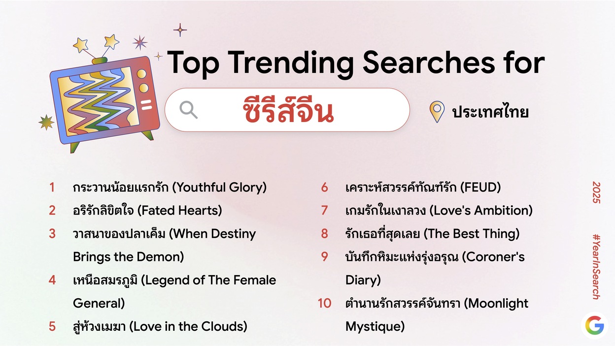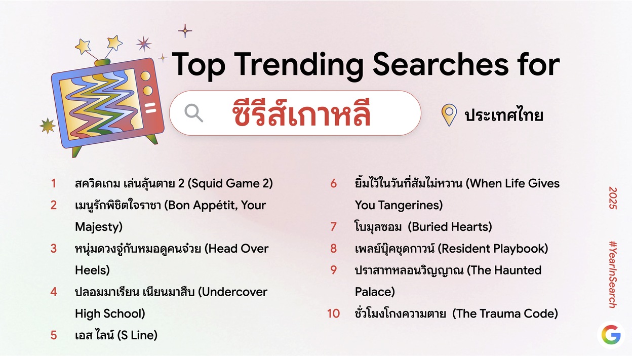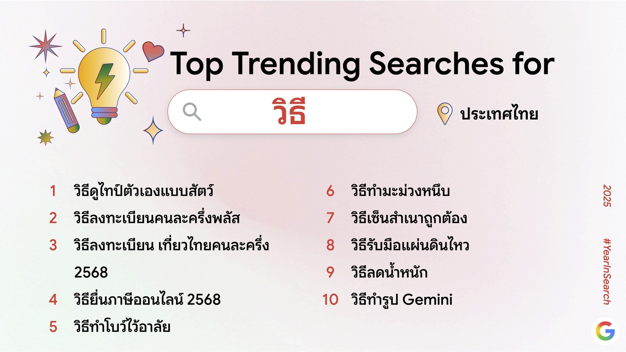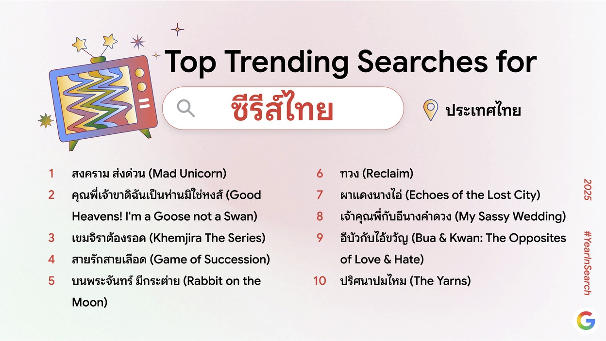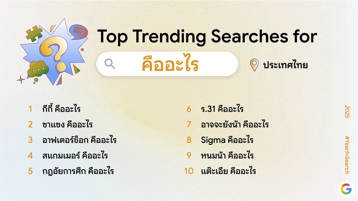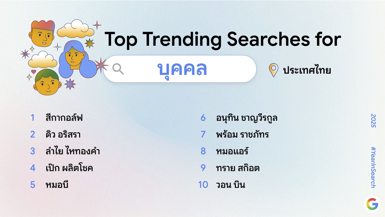 เป็นธรรมเนียมทุกปีที่ Google ประเทศไทย จะเปิดเผยถึงอินไซต์ Year in Search หรือ คำค้นหายอดนิยม เพื่อจะสะท้อนภาพรวมความสนใจของคนไทยตลอดทั้งปี โดยคำค้นหายอดนิยมประจำปี 2568 สิ่งที่คนไทยให้ความสนใจมีดังนี้