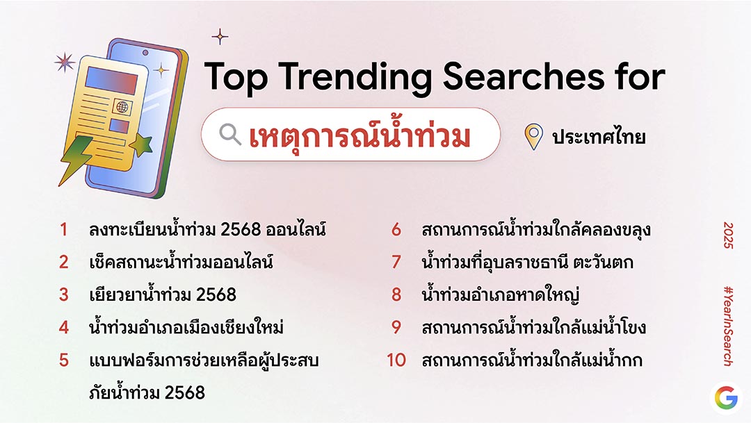 ความกังวลของคนไทยต่อสถานการณ์น้ำท่วมในหลายพื้นที่ของประเทศ ซึ่งส่งผลต่อชีวิตประจำวันทั้งการเดินทาง และความปลอดภัยสะท้อนผลอย่างชัดเจน โดย “ลงทะเบียนน้ำท่วม 2568 ออนไลน์” ครองอันดับ 1 คำค้นหายอดนิยมหมวดเหตุการณ์น้ำท่วม ตามด้วย “เช็กสถานะน้ำท่วมออนไลน์” “เยียวยาน้ำท่วม 2568” “น้ำท่วมอำเภอเมืองเชียงใหม่” “แบบฟอร์มการช่วยเหลือผู้ประสบภัยน้ำท่วม 2568” ในอันดับ 2- 5 ตามลำดับ และล่าสุด “น้ำท่วมอำเภอหาดใหญ่” ซึ่งเป็นเหตุการณ์ที่เกิดขึ้นได้ไม่นาน ก็พุ่งขึ้นมาติดโผใน 10 อันดับแรกอย่างรวดเร็ว