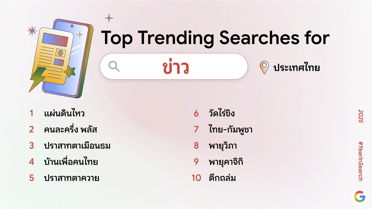 เมื่อเกิดเหตุการณ์ที่ส่งผลต่อชีวิตประจำวันคนไทยยิ่งต้องการเข้าถึงข้อมูลที่เชื่อถือได้ รวดเร็ว และแม่นยำมากขึ้น โดยปีที่ผ่านมาเต็มไปด้วยเหตุการณ์ไม่คาดคิดที่เกิดขึ้นอย่างฉับพลัน ส่งผลให้การค้นหาใน หมวดข่าว ประจำปี 2568 สะท้อนความต้องการข้อมูลที่ทันสถานการณ์ทั้งในและต่างประเทศอย่างชัดเจน โดย “แผ่นดินไหว” ครองอันดับ 1 ของคำค้นหายอดนิยมหมวดข่าว ขณะที่นโยบายภาครัฐอย่าง “คนละครึ่ง พลัส” และ “บ้านเพื่อคนไทย” ยังคงเป็นประเด็นสำคัญที่คนไทยให้ความสนใจเพื่อยกระดับด้านคุณภาพชีวิต