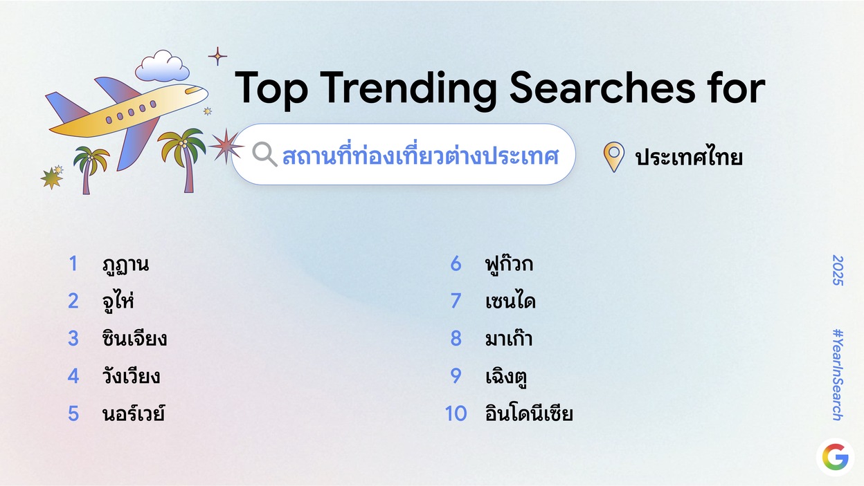 ด้านหมวดสถานที่ท่องเที่ยวต่างประเทศ เทรนด์การค้นหาในปีนี้ชี้ให้เห็นถึงการ “ออกนอกกรอบ” ของนักเดินทางไทย ที่เลือกจุดหมายใหม่ๆ เพื่อประสบการณ์ที่ไม่ซ้ำใคร โดย “ภูฏาน” ครองอันดับ 1 ด้วยเสน่ห์ของธรรมชาติและวัฒนธรรมอันโดดเด่น ตามด้วย “จูไห่” “ซินเจียง” “วังเวียง” “นอร์เวย์” “ฟูก๊วก” “เซนได” “มาเก๊า” “เฉิงตู” และ “อินโดนีเซีย” ตามลำดับ ซึ่งสะท้อนความสนใจที่หลากหลายมากยิ่งขึ้น ทั้งสายแอดเวนเจอร์ สายวัฒนธรรม และสายตามหาภูมิประเทศแปลกใหม่
